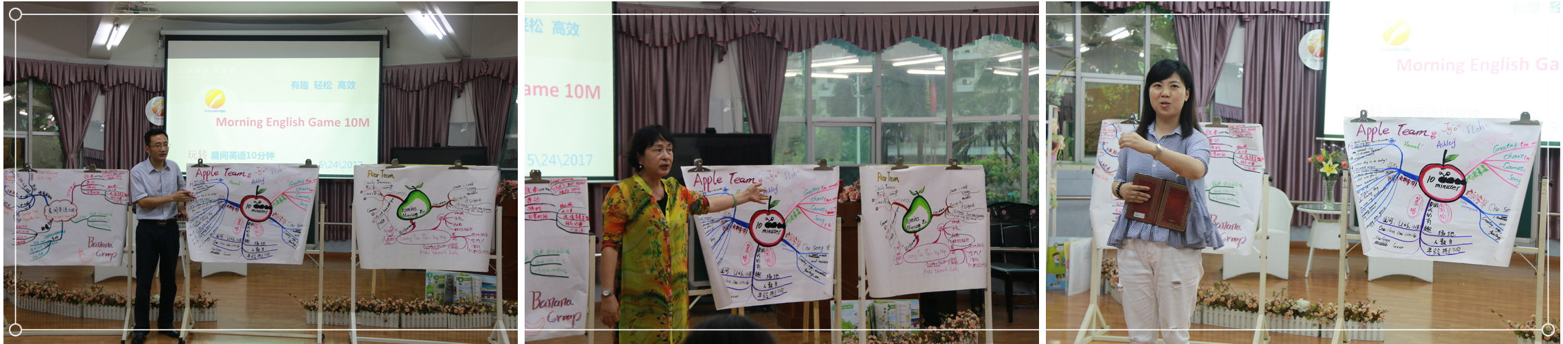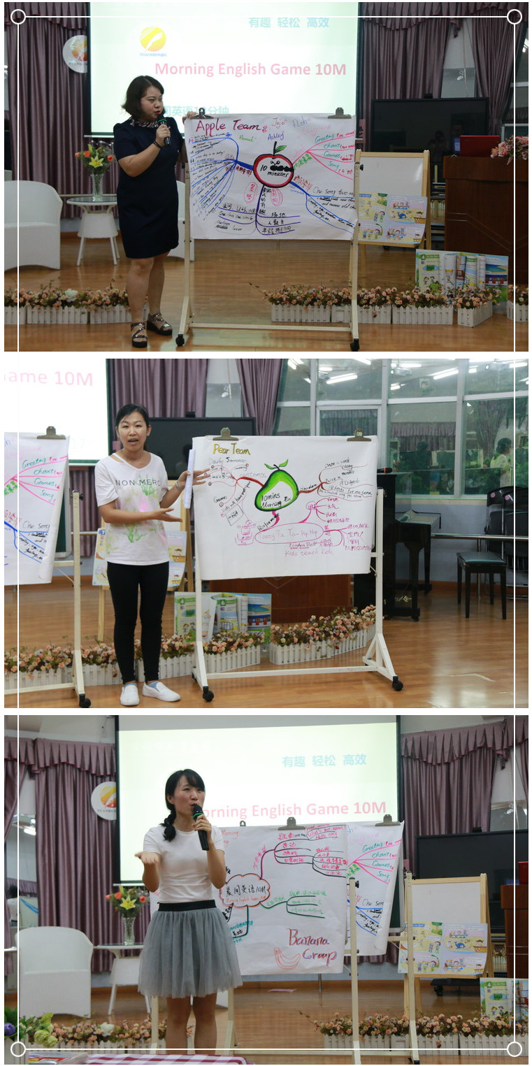 最后,我們的唐玉萍總監(jiān)(上一)、孫樹志老師(下左一)和黃欣園長(zhǎng)(下右一)也為我們此次活動(dòng)做了簡(jiǎn)要的點(diǎn)評(píng)和梳理,希望我們能做出更進(jìn)一步的修整,也提出了一些更有效的方法意見:創(chuàng)編新穎的英語游戲(New English Game);根據(jù)不同的場(chǎng)地、內(nèi)容,靈活采用不同的組織形式,提高晨間英語游戲的質(zhì)量(quality),如圓形、長(zhǎng)方形、U形隊(duì)列;內(nèi)容的安排結(jié)合月歷活動(dòng)及節(jié)假日。如,九月份新生入學(xué),我們以簡(jiǎn)單的問候語作為切入,拉近師幼關(guān)系,安撫幼兒剛開學(xué)的焦慮情緒等。