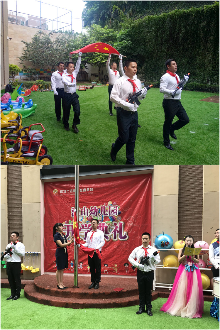 隨著音樂(lè)唱響慷慨激昂的國(guó)歌,由爸爸們擔(dān)任旗手將五星紅旗冉冉升起!