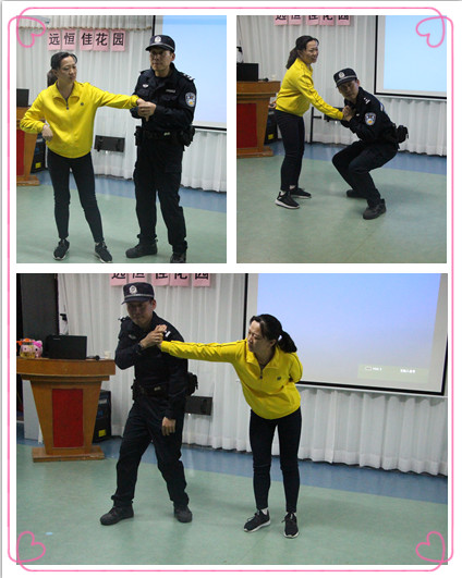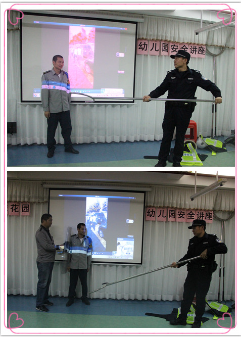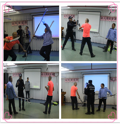 首先,劉教官對于我們身邊的沃爾瑪恐怖事件、羅湖砍殺事件、寶安區(qū)519等暴力事件進(jìn)行了視頻播放和詳細(xì)分析,不僅讓全體教職員工深切體會到了暴力事件的可怕性,而且提高提高了教職工的反恐防暴意識。然后,劉教官分別對于保安和教師的反恐防暴技巧進(jìn)行了演示指導(dǎo)。例如,讓一名保安扮演暴力嫌疑人,對鋼叉和防暴盾牌的使用方法進(jìn)行了指導(dǎo)和演示;老師扮演受害者,演示如何進(jìn)行自我保護(hù)。最后,針對幼兒園的實(shí)際情況對反恐防暴提出了以下幾點(diǎn)注意事項:一、一旦有危險人物或暴徒闖入,教師不要慌,一定要保持冷靜;二、關(guān)緊門窗,盡量把孩子與危險人物隔離開,將幼兒隱蔽起,避免近距離接觸,引起傷害;三、一定要想辦法拖延時間,等待救援,盡量避免身體正面接觸,引起不必要的傷亡;四、一旦發(fā)生意外事件,馬上報警,將傷害降到最低程度。