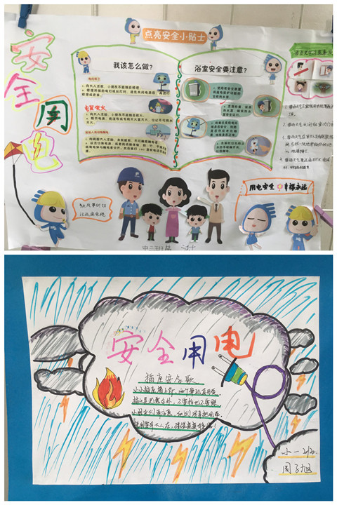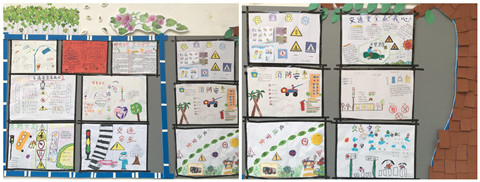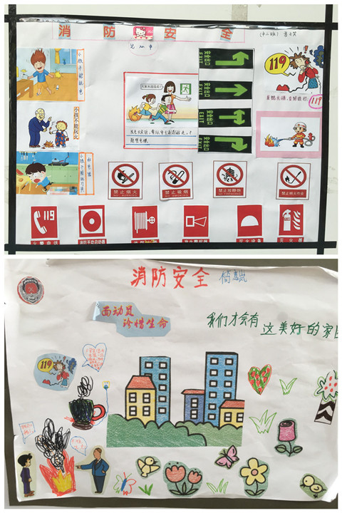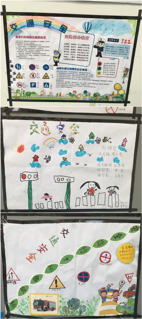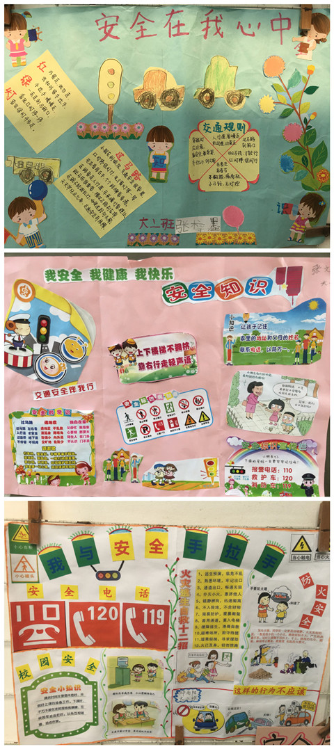 為了將枯燥的安全知識生動的展現(xiàn)在孩子面前,我園在走廊制作了兩塊《安全兒歌》板,張貼朗朗上口的安全兒歌、安全標(biāo)志、并配合卡通圖案,吸引幼兒認(rèn)識常見的安全標(biāo)志,孩子們在走廊散步的時候可以習(xí)得有關(guān)安全方面的知識。通過向家長發(fā)放致家長一封信和親子制作以食品安全、交通安全、消防安全、居家安全、自然災(zāi)害安全為主題親子剪貼報宣傳校園安全知識,增強幼兒和家長的安全意識,提高自護自救能力。
