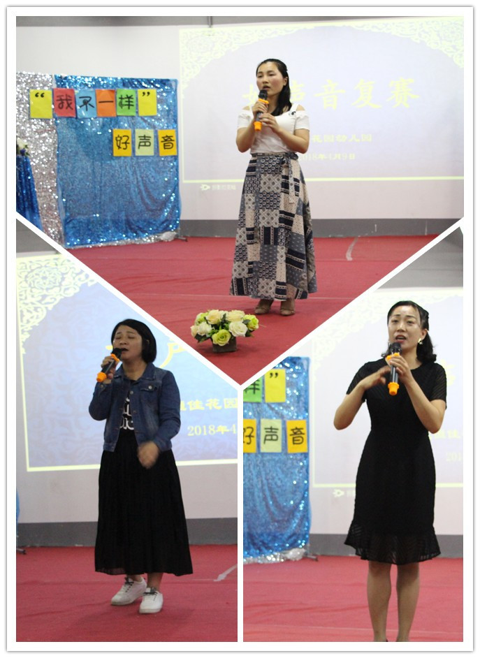 本著公平、公正和人人參與的原則,每個級組都從最初的班級選拔到園級初賽、再到園級的復賽,為參加集團的決賽做準備。歌手們的歌唱風格多樣,有的深情、有的熱情、有的低沉,都在用自己獨特的嗓音訴說著自己的故事和美好愿望。孫慧老師的《我在納林湖等著你》,將我們帶到了天藍草綠、鳥兒歌唱、碧波蕩漾的納林湖,似乎聽到了潺潺的湖水聲。大五班吉利寧干媽的那獨特的嗓音吟唱出《心手相連》,讓我們感受到了不一樣的熱情與愛。各位參賽選手那自信的神態(tài)、深情而富有感染力的聲音都贏得了觀眾們陣陣熱烈掌聲和歡呼。