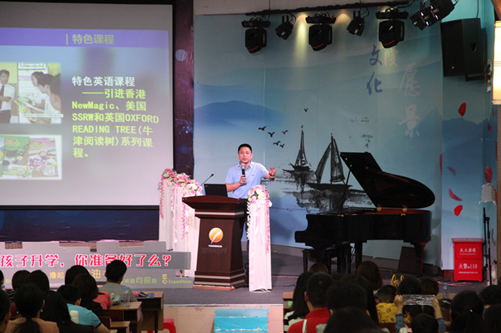 每場(chǎng)次的培訓(xùn)講座分四個(gè)主要環(huán)節(jié):一是長(zhǎng)期工作在小學(xué)教育一線的教育能手作培訓(xùn)講座;二是集團(tuán)學(xué)校建設(shè)管理方面的專家與家長(zhǎng)進(jìn)行幼小銜接經(jīng)驗(yàn)交流;第三個(gè)環(huán)節(jié)穿插在前二個(gè)環(huán)節(jié)中,利用培訓(xùn)講座間隙,由集團(tuán)親子教育導(dǎo)師與幼兒家長(zhǎng)進(jìn)行互動(dòng)。第四個(gè)環(huán)節(jié)是集團(tuán)安排專門人員參觀龍華中英文實(shí)驗(yàn)學(xué)校的校園環(huán)境、小班化、國(guó)際化、校園文化等方面的建設(shè)情況。